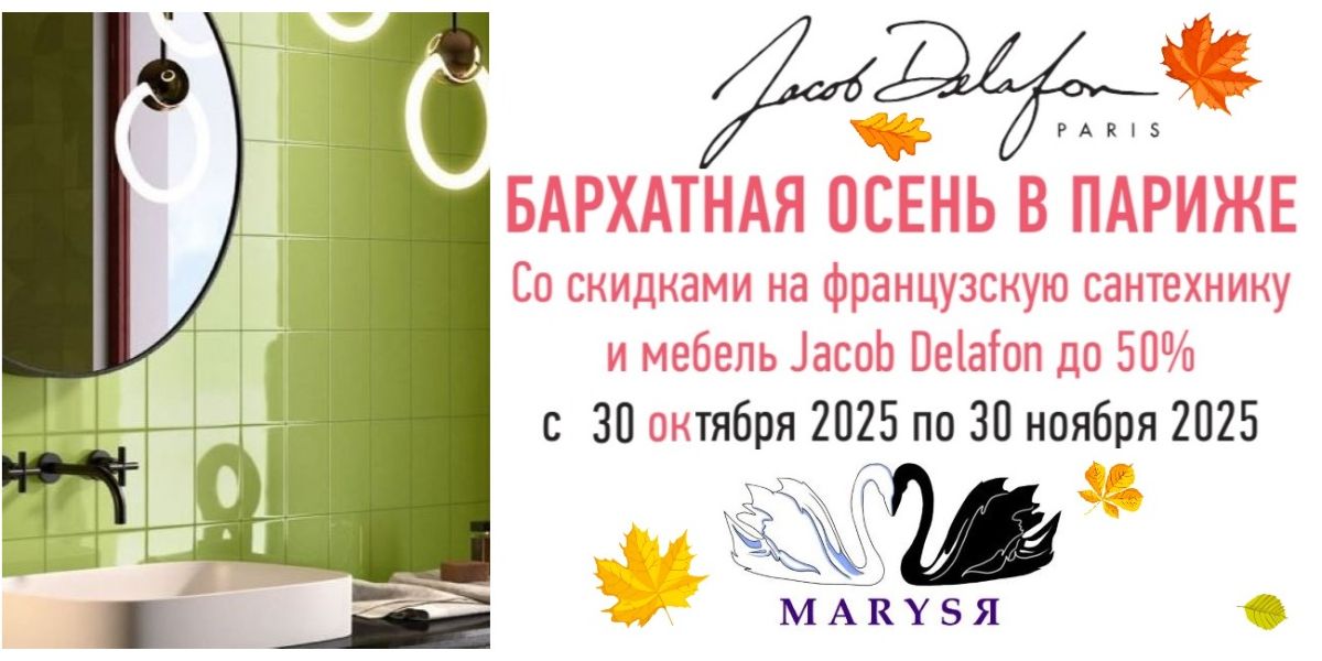 Всего один месяц осени 2025 года остался у нас с Вами и один месяц скидки по акции французской сантехники фирмы Jacob Delafon «Бархатная осень» со скидками до 50 %