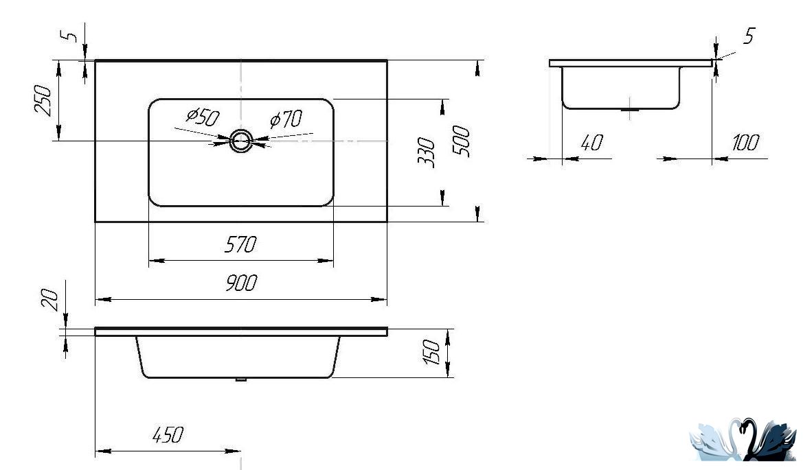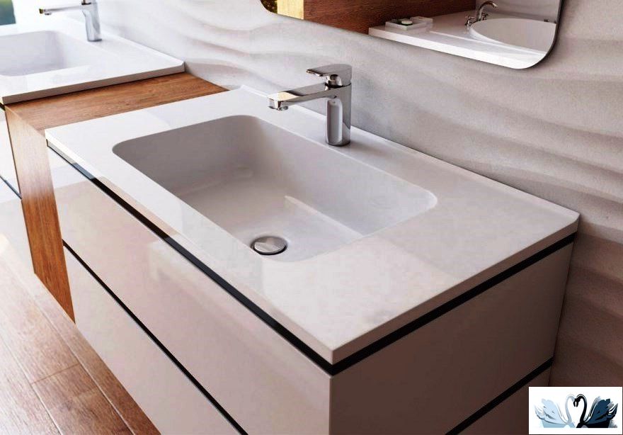 Форма раковины - прямоугольная с чашей в виде прямоугольника с закругленными углами.