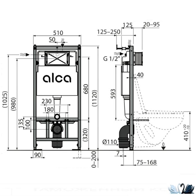 Размеры инсталляции (В х Ш х Г) 1120 х 510 х 125 мм. Высота рамы инсталляции и ее расстояние от стены регулируются.
