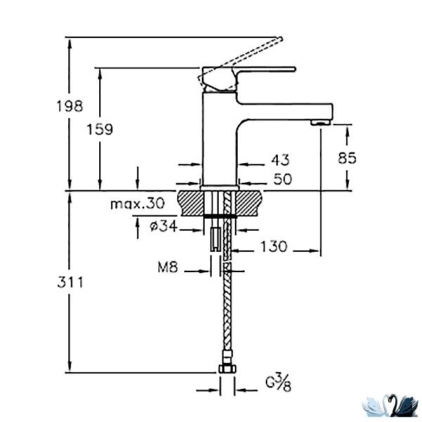 Высота смесителя: 159 мм, Высота излива: 85 мм. Длина излива: 130 мм. Ширина: 50 мм.