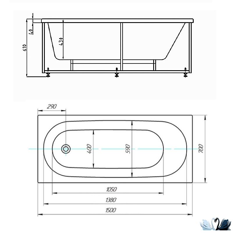 Особенности - стандартное расположение слива-перелива, овальная чаша ванны с прямыми линиями бортов и округлыми передней и задней стенками. Такая форма ванны является популярной у таких брендов, как Villeroy & Boch Oberon, или Aquatek Оберон, или Ravak Sonata II, или Vagnerplast Kasandra. Такая модель ванны зарекомендовала себя качеством, удобством.
