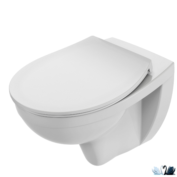 Подвесной унитаз Patio rimless EDV102-00 - овальной формы с безобоковым смывом и системой антивсплеск, с широким бордюром по ободу чаши уитаза. Дюропластовое сиденье для унитаза с функцией микролифт.
