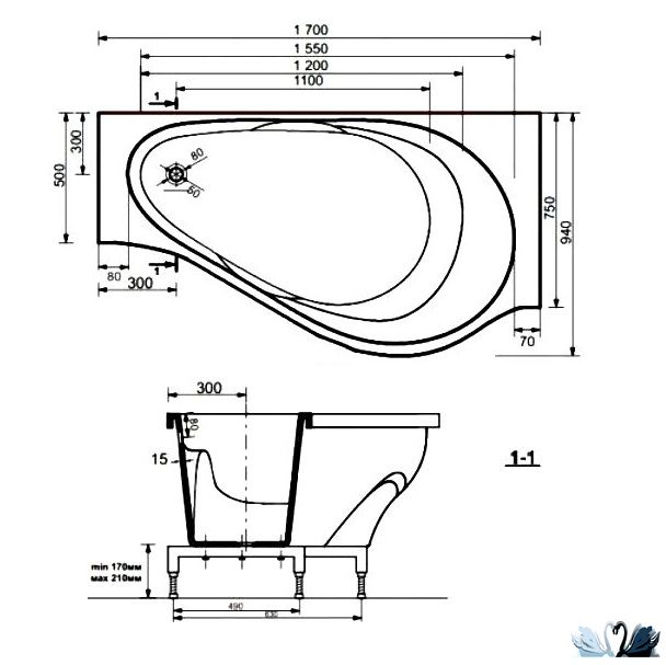 Особенности: Слив - перелив располагается в зауженном месте по центру и в пристенном борту, асимметричный дизайн выполнен как снаружи, так и внутри ванны. Форма чаши - каплевидная, овальная, с заужением в месте слива.