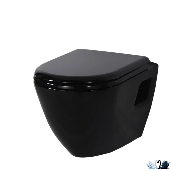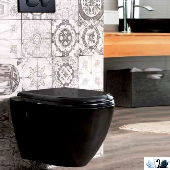 Турецкое производство подвесного унитаза - черная глянцевая поверхность, компактный размер, сиденье с микролифтом.