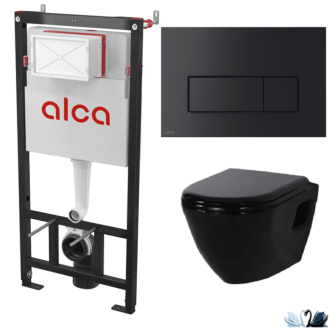 Инсталляция для унитаза фирмы АлкаПласт с креплением и черной клавишей смыва в комплекте с черным глянцевым подвесным унитазом Креавит Терра в магазине MARYSЯ. Комплект 5 в 1.