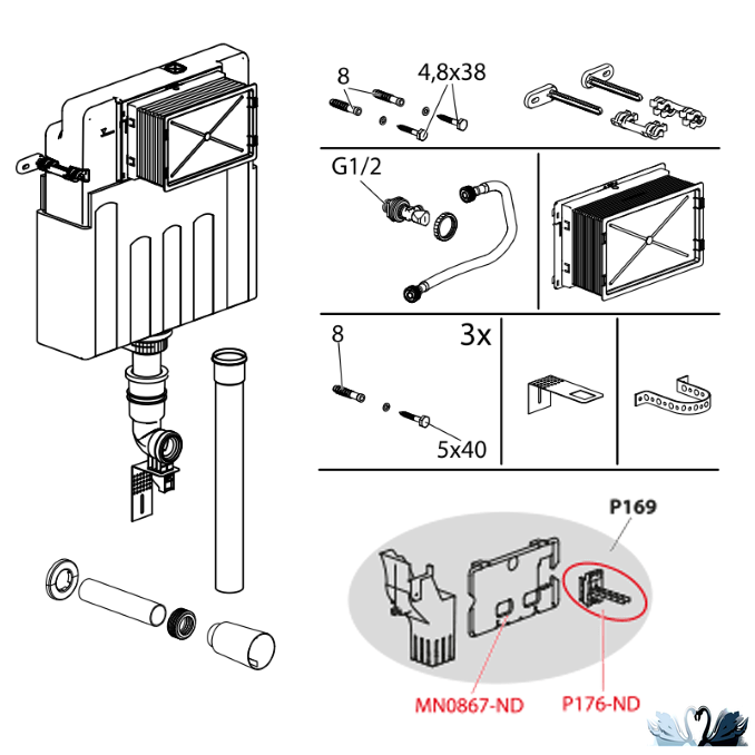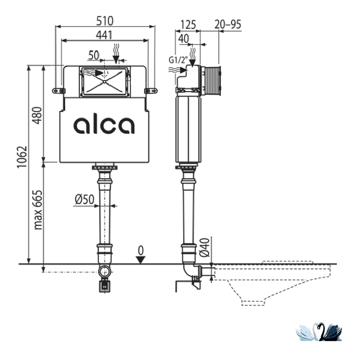 Размеры бачка (В х Ш х Г) 480 х 441 х 125 мм. Высота монтажа инсталляции можно отгрегулировать. Рекомендуемая высота установки - 1062 мм.