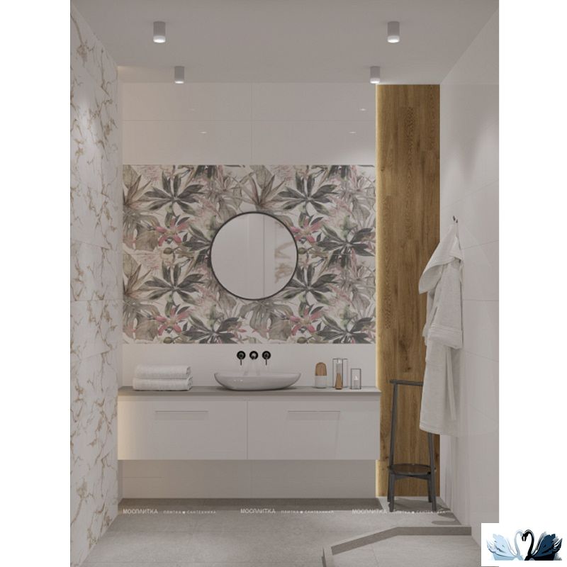 Она соединяет три различных направления. Мрамор уводит к Классике, плитка с тропической зеленью подводит к Бионике или Этно, а чисто белый кафель с золотыми вставками дань Ретро или богатому Барокко. Каждый элемент обогощает предложение и делает работу дизайнера интересной и увлекательной.