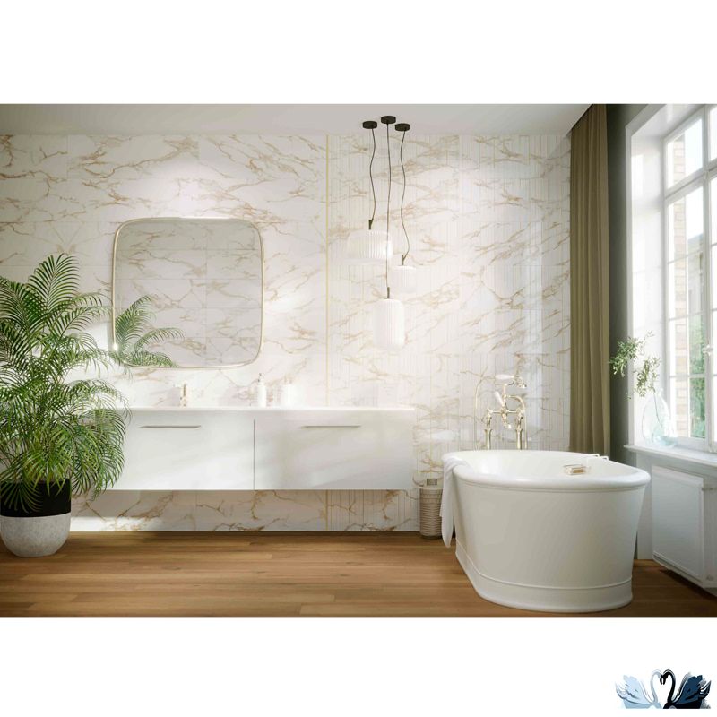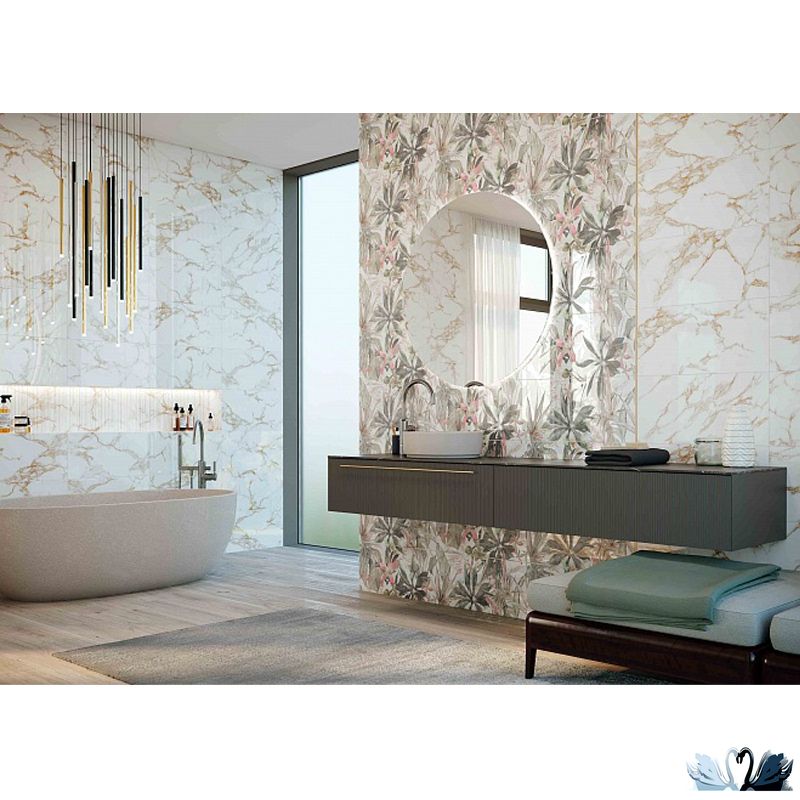 В серию Шайн входит фоновая плита 30 х 90 под мрамор для стен в трех цветах (с золотыми разводами, тропическими цветами или снежно-белый), один вид декора 30 х 90 с геометрическими мотивами и позолотой.