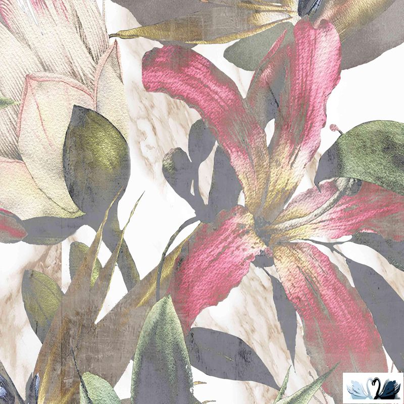 Цвет фона - основной молочно-белый с кремовыми(золотыми) прожилками, имитирующий натуральный мрамор, по фону плиты изображены разнообразные листы растений и цветы.