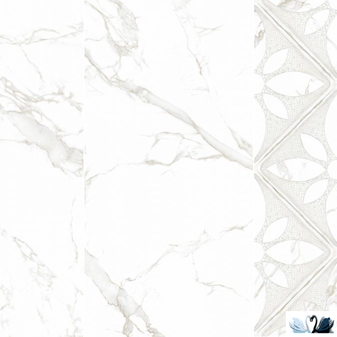 Фоновая текстура - имитация классического мрамора с жемчужно-белым фоном с серыми и золотисто-бежевыми зернами, разводами и прожилками. Это цветовая разновидность самого известного в мире мрамора - Calacatta. Самые распространенные варианты - Calacatta Classic, Calacatta Lasa, Calacatta Splendor, Calacatta Vagli и Calacatta Gold (Oro). Дизайнеры взяли часть разнообразного рисунка природного камня, упорядочили цвет его прожилок, получив элегантный, богатый дизайн плитки. Посмотри и сравни на фото!