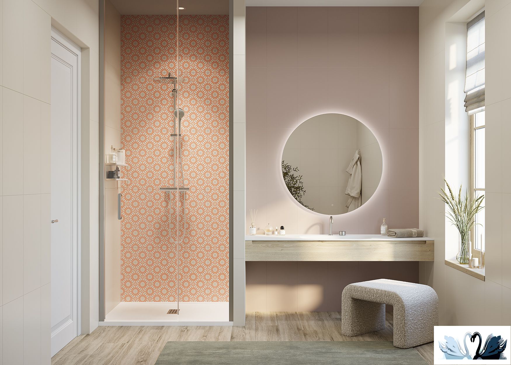В эту серию входит настенная плитка с текстурой под терраццо трех оттенков, а также несколько вариантов фоновой пликти и яркий декор.