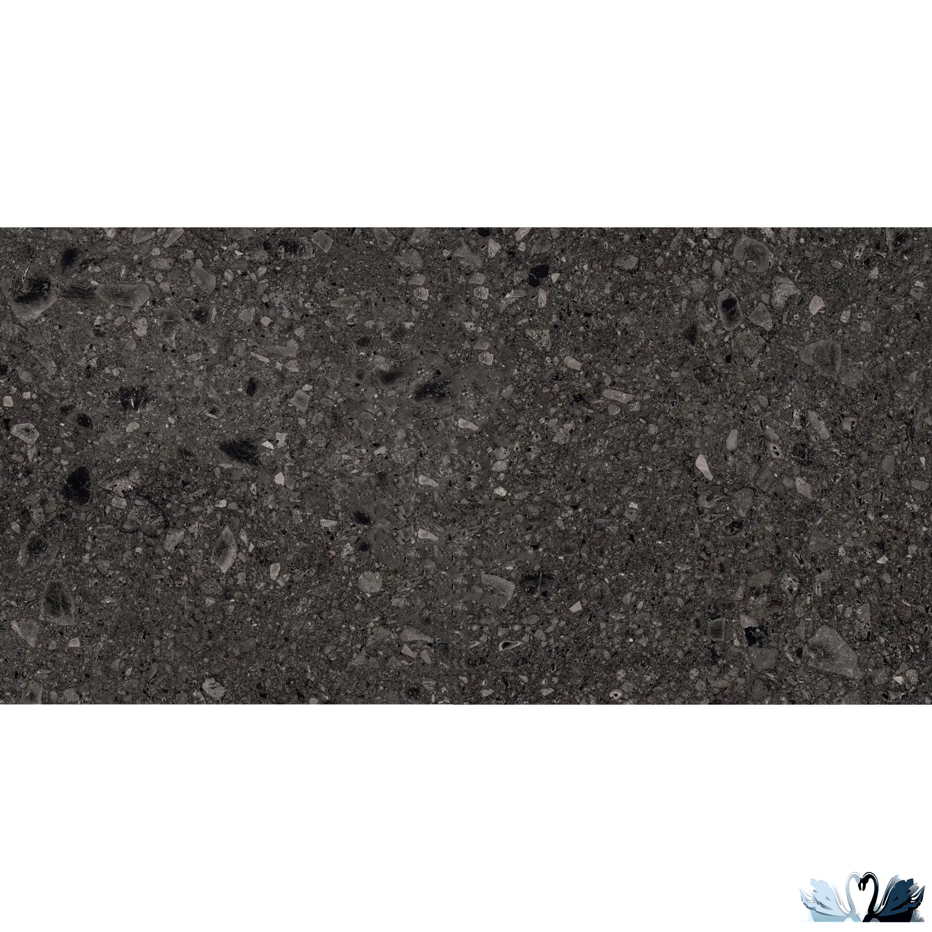 Цвет фона - графитовый или цвет черной золы (пепла). Фоновый рисунок имитирует мозаичную поверхность из мраморной и каменной крошки, скреплённой цементом в единую поверхность, - венецианский терраццо (терацо). Особенный эффект придает карвинг. Поверхность "карвинг" - новая, набирающая популярность поверхность премиального качества. В результате сложного производственного процесса поверхность плитки получается похожей на структурированную (с микро рельефом) матовую с пятнами, отблескивающими при изменении угла зрения