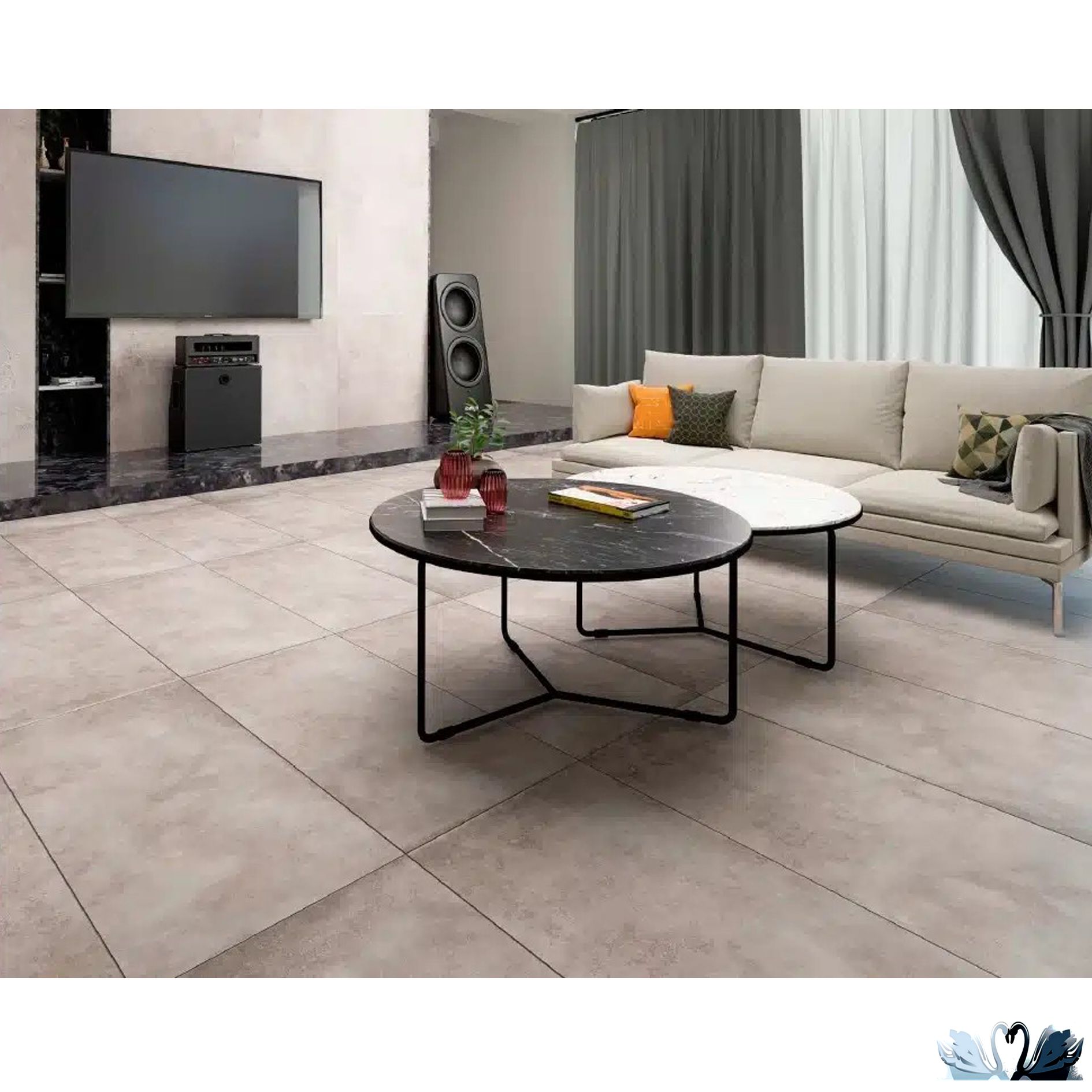 Ректифицированный, матовый, глазурованный керамогранит под бетон представлен в нескольких цветах и размеров.