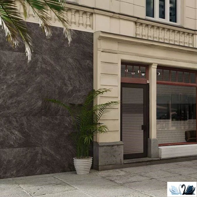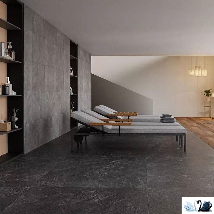 Ректифицированный, матовый керамогранит со слабым рельефом под камень представлен в нескольких цветах и оттенках серого.
