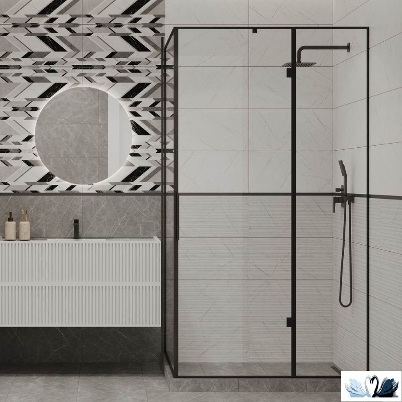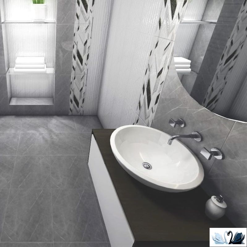 В серию входит фоновая плита двух цветов (белого и серого - для стен, серого - для пола), и декоративная плита (рельефный декофон и вставка с металлизацией и люстром).