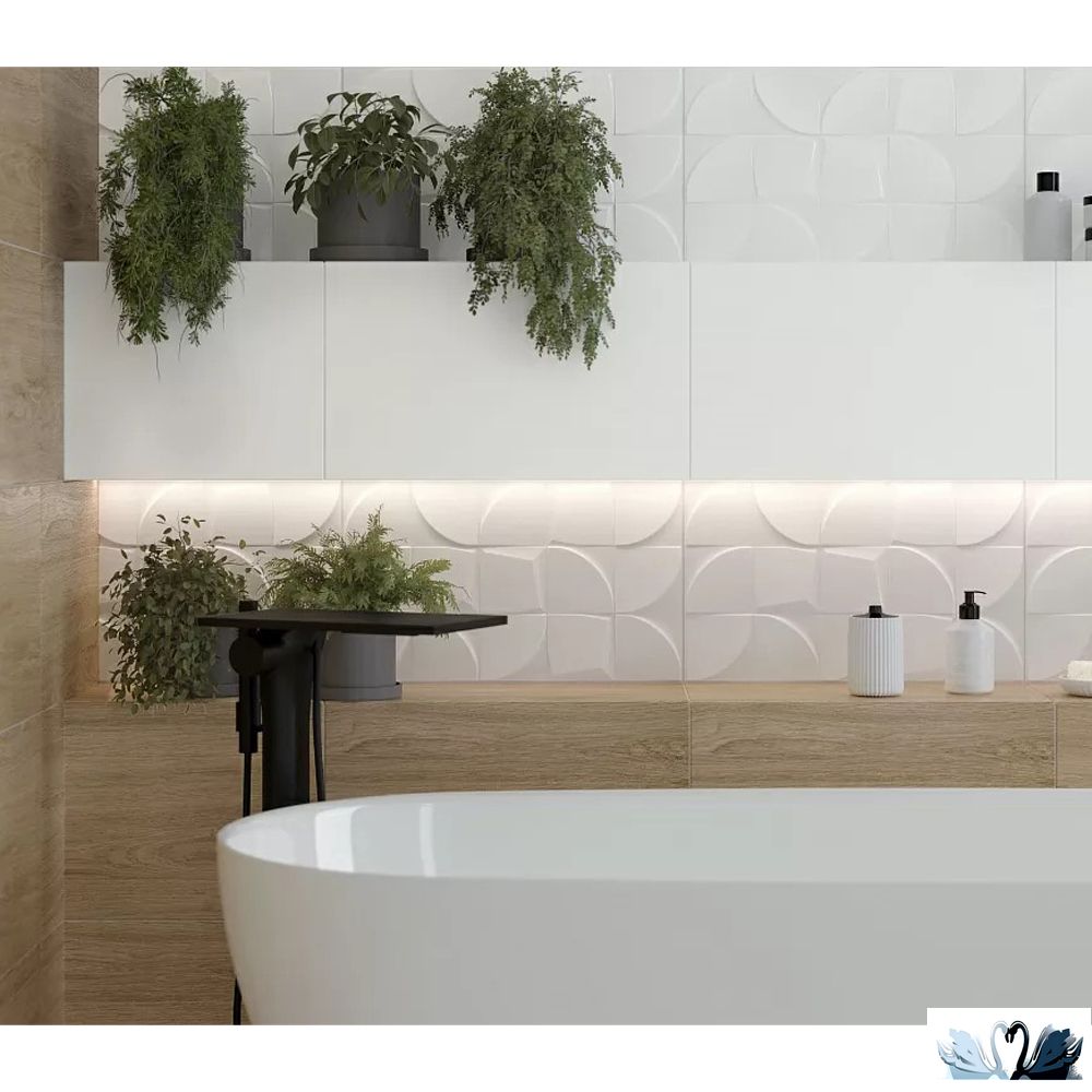 Изюминкой коллекции Nature является не только сочетание разных текстур, но и сочетание разных поверхностей – глянцевого моноколора с матовым деревом. А использование природных мотивов в декоре особенно подчеркивает скандинавское настроение. Основные цвета: белый и натуральный бежевый. Выверенный подбор элементов коллекции даёт возможность с легкостью создать светлый и уютный интерьер вне времени. Текстура базовых плит – моноколор, а акцентной – дерево. Декоративным фоном выступает поверхность с тонким линейным орнаментом, который представляет лёгкие прожилки листьев, объединенные в разнонаправленную композицию. Деликатный объём ей придаёт микрорельеф, который получается благодаря использованию органических реакционных чернил. В сочетании с глянцевой поверхности микрорельеф наполняет плитку богатым блеском, за счет чего она и приобретает свою декоративность.