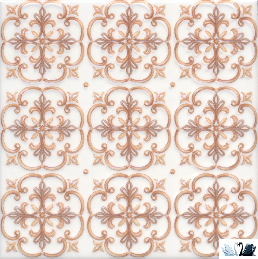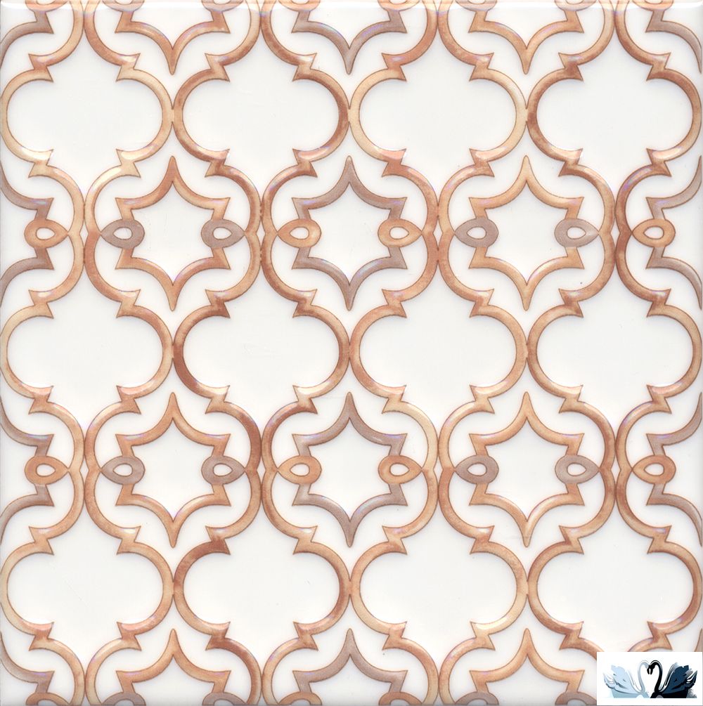 Цвет фона - белый. Рисунок - майолика, растительные узоры. Цвет рисунка - бежевый, медный, золотой.