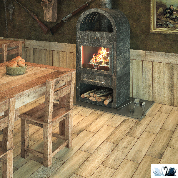 Фактура - шероховатая. Фон - доски дерева, в продольном разрезе. Имеется несколько разнообразных штамповых принтов плитки. Класс износостойкости - 4.