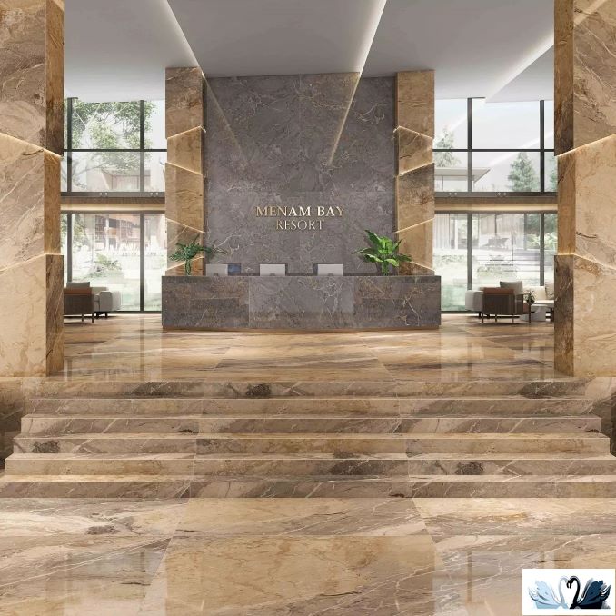 Дизайнеры взяли часть богатого рисунка камня, насытили его сетью прожилок различных цветов, получив износостойкий, разносторонний дизайн.