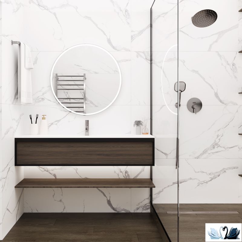 Цвет - белоснежный с серыми прожилками и разводами, напоминающий классический итальянский камень Bianca Carrara (Бьянка Каррара).