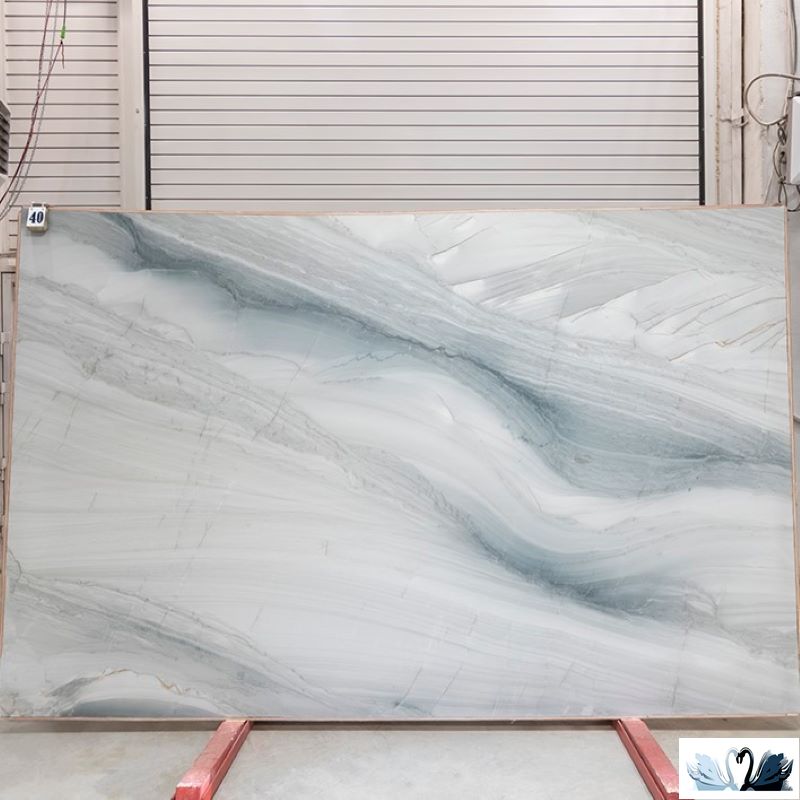 Фоновая текстура - имитация разновидности бразильского кврцита Deep Ocean или Ocean Blue, на наш взгляд. Причудливый рисунок дымчато-голубых, серовато-синих оттенков образует узорчатые ажурные потоки с росчерками белых и серых стрел. Дизайнеры взяли только часть богатого рисунка камня, укратили буйство рисунка его прожилок, получив оригинальный и эффектный дизайн.