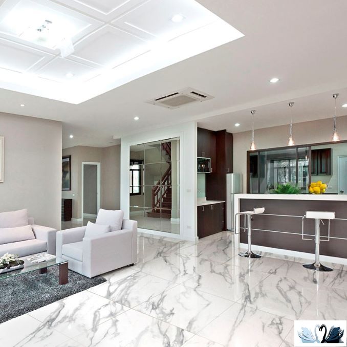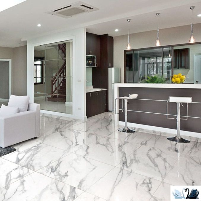 Цвет - белоснежный мрамор с сетью прожилок и разводов, напоминающий натуральный итальянский камень Arabescato Elegante.