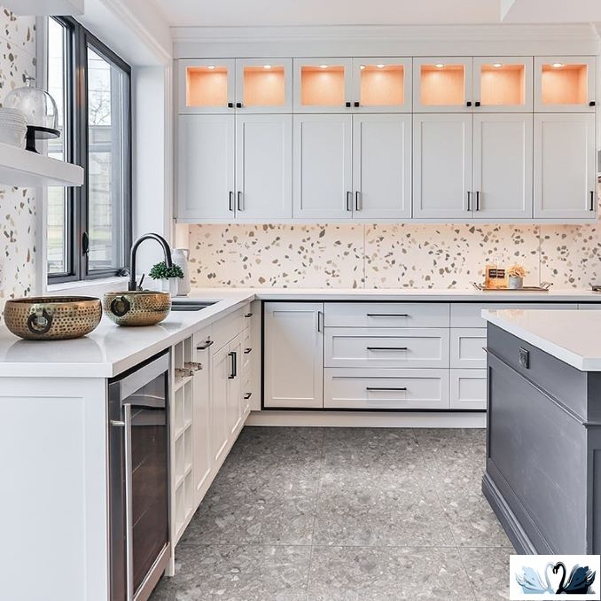 Фоновый рисунок имитирует серую мозаичную поверхность из мраморной и каменной крошки, скреплённой цементом в единую поверхность, - венецианский терраццо (терацо).