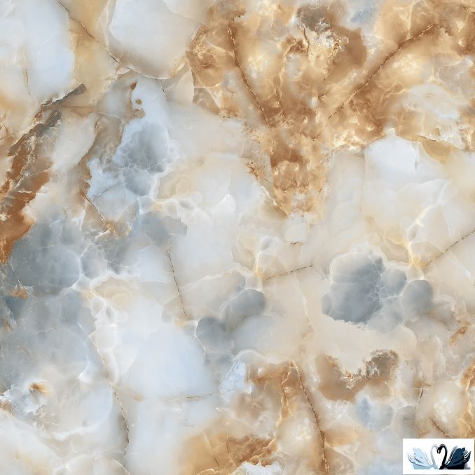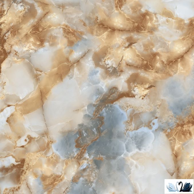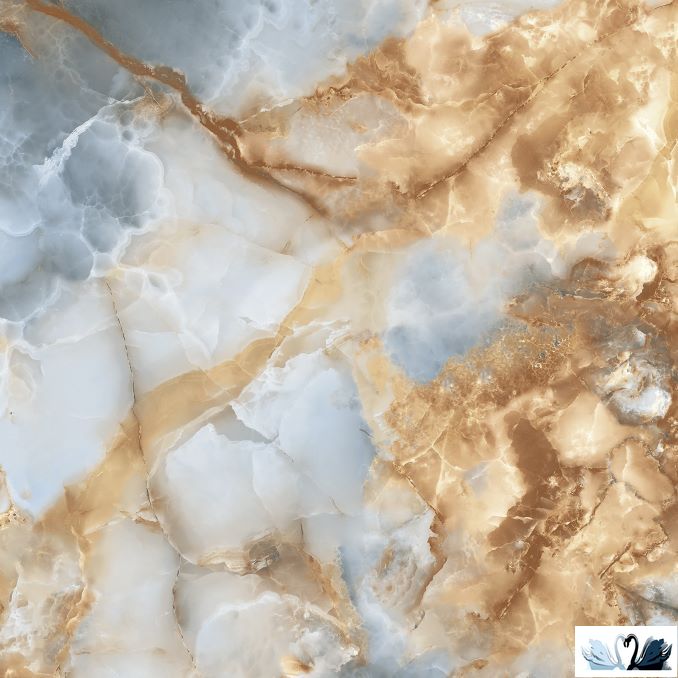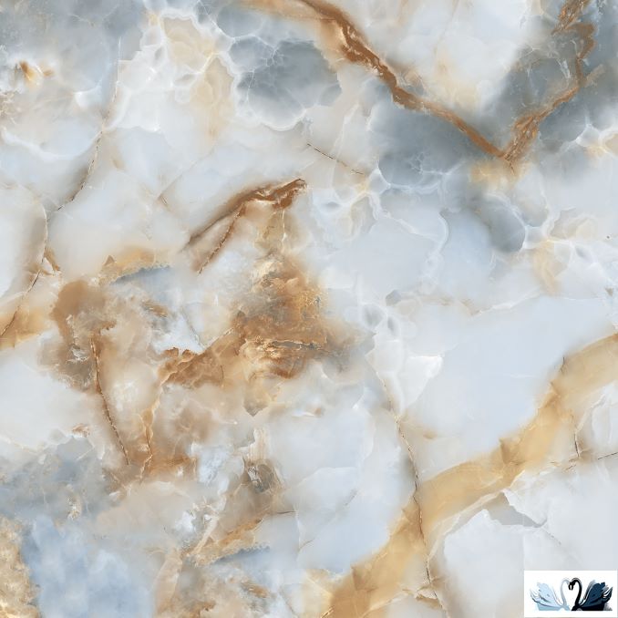 Цвет фона - дымчато-голубой с бежево-золотыми прожилками и разводами, напоминающий кварцит Patagonia Crystal Gold.