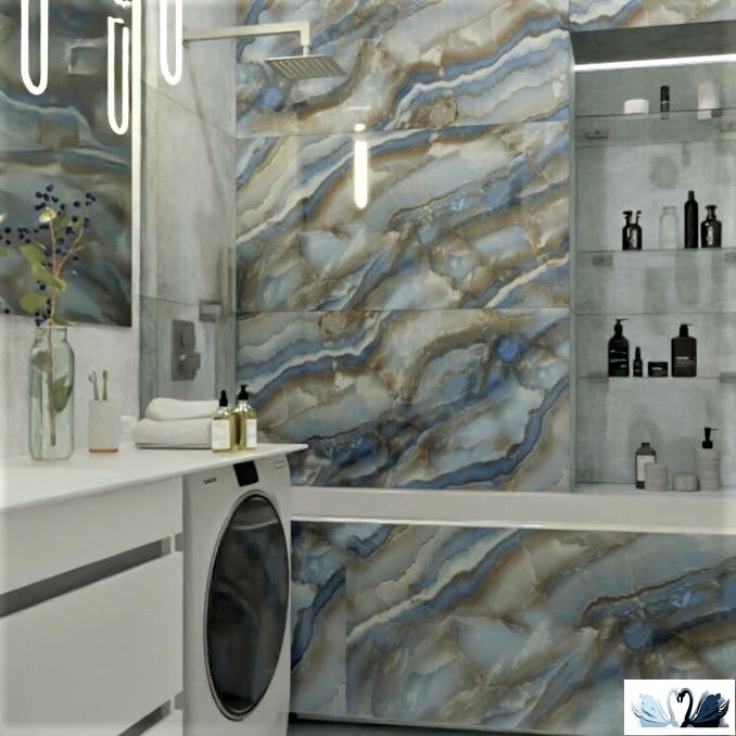Фоновая текстура - имитация природного камня Onyx Blue Premium (Оникс Блу Премиум), на наш взгляд, с распиловкой Vein cut , т.е. продольно, вдоль вен. Посмотри фото и сравни! Оникса такой расцветки не существует в природе, но воображение дизайнера может творить чудеса! Дизайнеры взяли только часть богатого рисунка камня, чуть притушили его яркость, упорядочили сеть его прожилок, получив оригинальный и эффектный рисунок.
