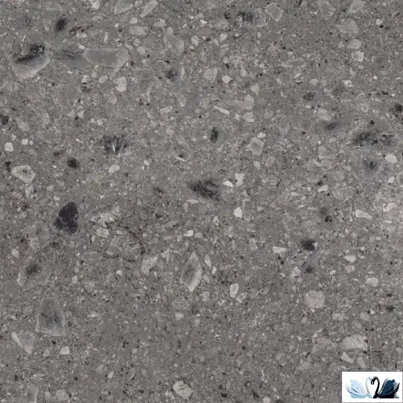 Цвет фона - серый или серебристый. Фоновый рисунок имитирует мозаичную поверхность из мраморной и каменной крошки, скреплённой цементом в единую поверхность, - венецианский терраццо (терацо). Особенный эффект придает карвинг. Поверхность "карвинг" - новая, набирающая популярность поверхность премиального качества. В результате сложного производственного процесса поверхность плитки получается похожей на структурированную (с микро рельефом) матовую с пятнами, отблескивающими при изменении угла зрения