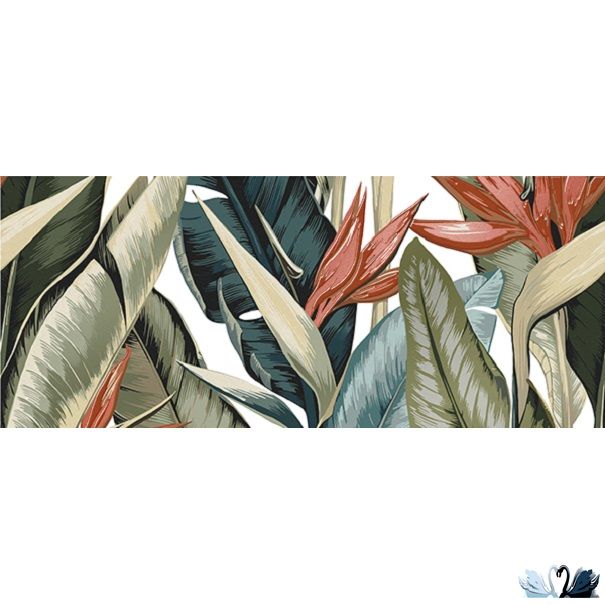 Рисунок декора - южноафриканский цветок стрелиция в обрамлении листвы разных оттенков от сине - зеленого до хаки.