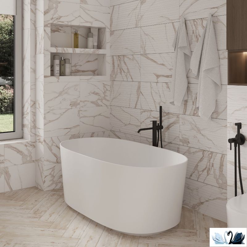 В серию входит фоновая плита для стен, декофон с горизонтальными рельефными полосами, а также фоновая плита для пола с мраморным рисунком.