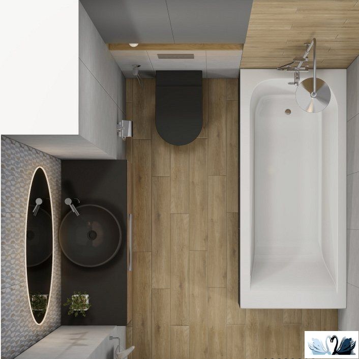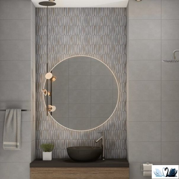 В эту серию входит настенная фоновая плитка под бетон светлого и темного оттенка, а также однотонная плитка с текстурой под дерево в холодной цветовой гамме и два варианта декора - геометрическая мозаика и пэчворк с этническими мотивами
