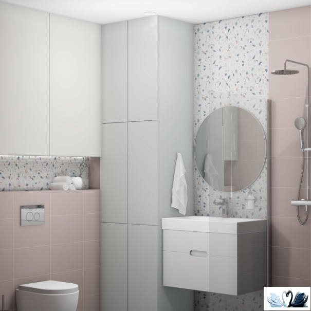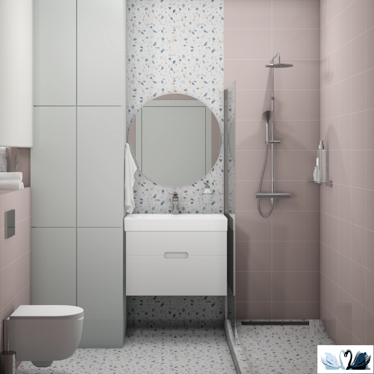 В эту серию входит настенная фоновая однотонная плитка в трех сдержанных ягодных оттенках, а также три варианта декора - геометрическая мозаика и декоры с мелкими переливающимися пятнами-бусинами в стиле примитивизма, образующими дугообразный принт или волну.