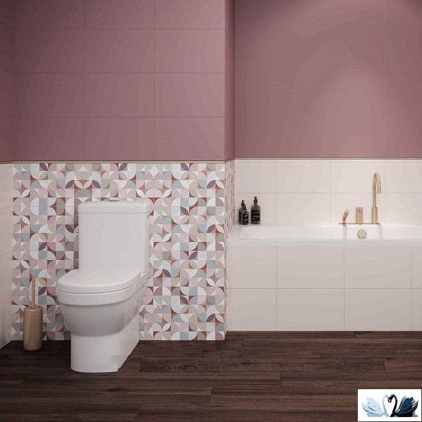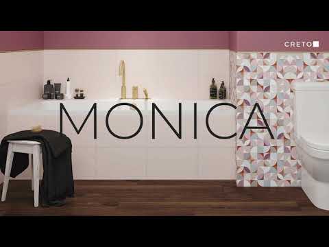 В серию Monica входит настенная фоновая однотонная плитка в трех сдержанных ягодных оттенках, а также три варианта декора - геометрическая мозаика и декоры с мелкими переливающимися пятнами-бусинами в стиле примитивизма, образующими дугообразный принт или волну.