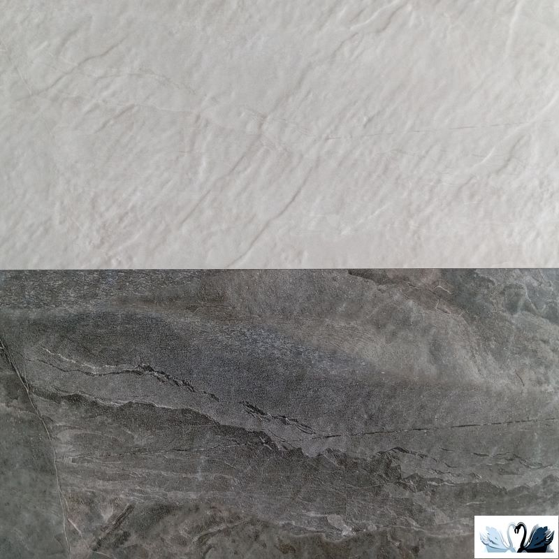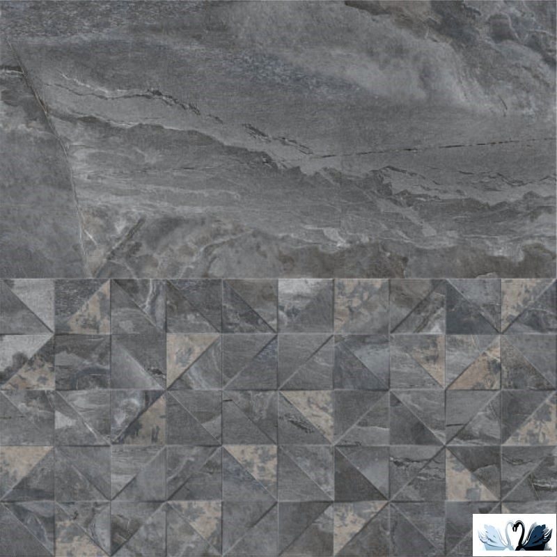 Фоновая текстура - имитация природного черного сланца, на наш взгляд. Можно еще дизайн этой плитки сравнить с песчаником с большим количеством глауконита, или с мрамором из из Турции Luna Grey Light (Луна Грей Лайт). Дизайнеры из Индии взяли только часть богатого рисунка камня, упорядочили его сеть прожилок, получив оригинальный и эффектный дизайн.