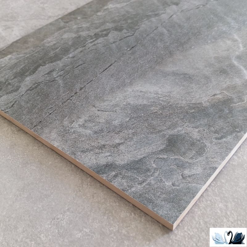 Цвет фона - Темно - серый с сетью прожилок и разводов, напоминающий натуральный итальянский черный сланец. Рельеф плитки повторяет фактуру так называмого "рваного камня".