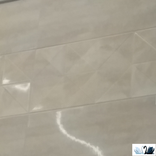 Цвет фона серо-бежевый с светло и темно-серыми разводами, полосками. Рисунок декофона - мозаичное сочетание гладких и рельефных треугольников, образующих 8 квадратов. Рельеф - ровные полоски.