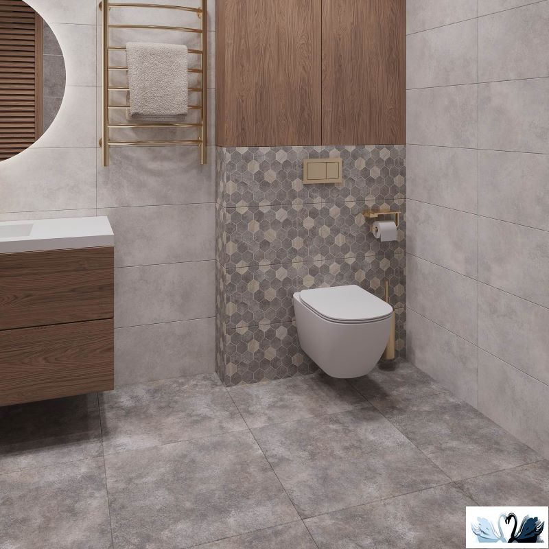 В серию входит фоновая плита для стен светлого и темного серого цвета, два вида декофона - один с принтом тропических растений и другой с геометрическим орнаментом из гексагонов, а также напольная плита темно-серого цвета.