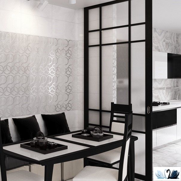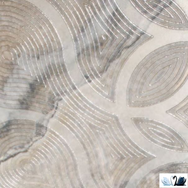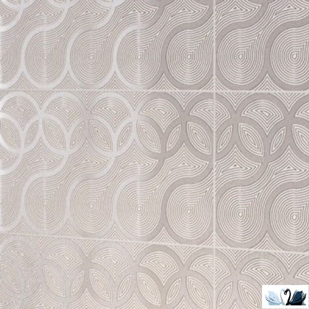 Вставка Камелот выполнена с использованием зеркального люстра и матовой эмали. Нитевидные рельефные и широкие матовые линии, переплетаясь, переходят в восьмерки и круги и складываются в оригинальный орнамент. Важно, что декор стыкуется и по вертикали, и по горизонтали – это дает возможность использовать его в интерьере в любом порядке.