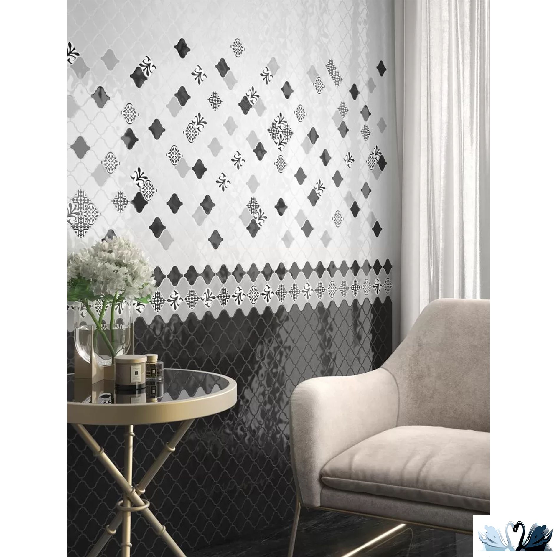 Фоновую плитку дополняет мозаика, украшенная узорами в стиле традиционного арабского орнамента.