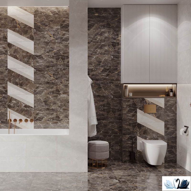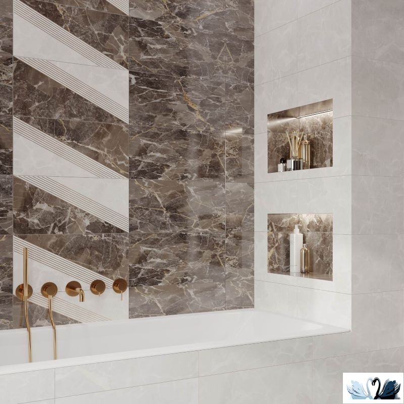 В серию входит фоновая плита для стен бежевого и коричневого оттенков, богатая декоративная вставка, совмещающая в себе белый и коричневый цвета, фоновая плита для пола коричневого оттенка.