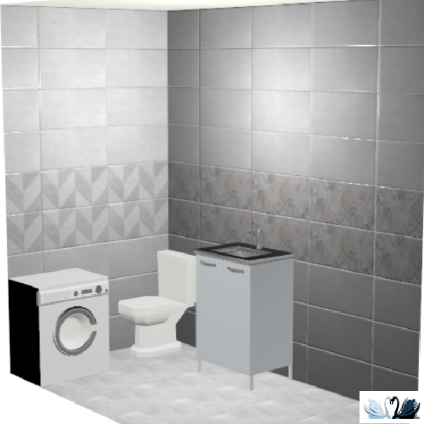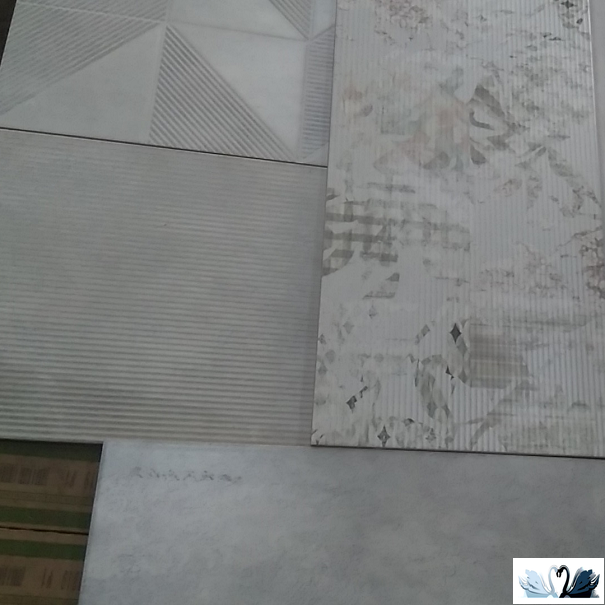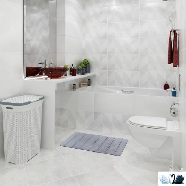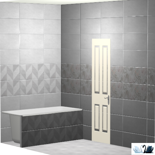 В серию входит настенная фоновая плитка светлого и темного оттенка, три варианта рельефного декофона - микс (пэчворк), мозаика (геометрия) и полоски, а также фоновая плитка для пола.