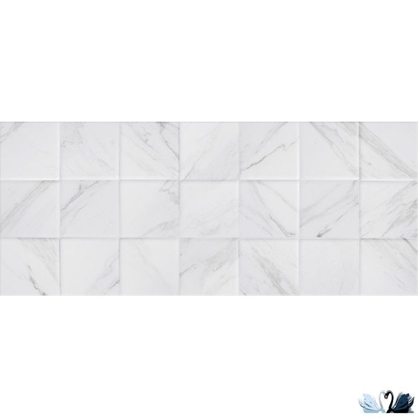 Цвет - белый с серыми прожилками. Фоновая текстура - имитация классического итальянского мрамора Bianca Carrara с жемчужно-белым фоном и дымчато-серыми зернами и прожилками. Имеется несколько разнообразных штамповых принтов плитки. Место применения - стены внутри помещений.