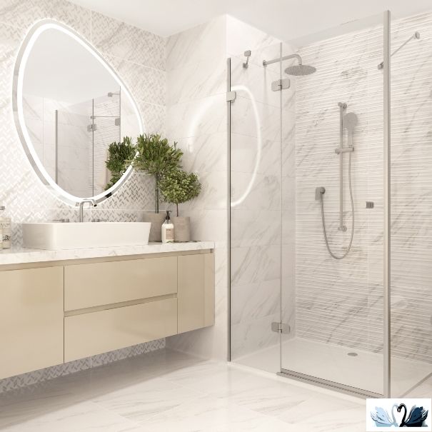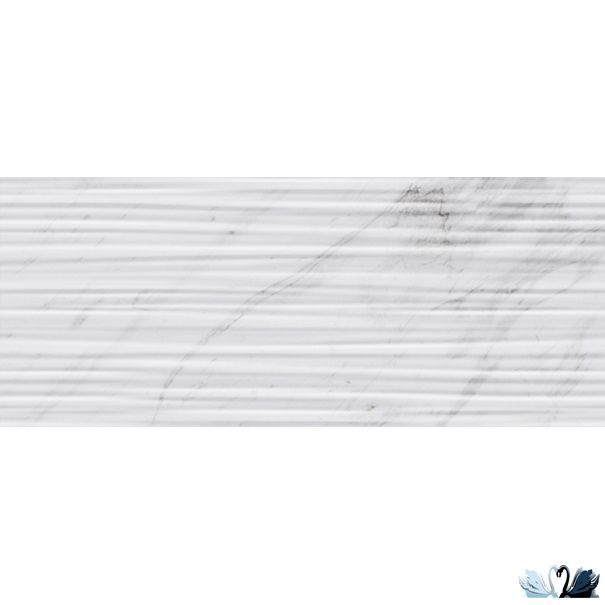 Цвет - белый с серыми прожилками. Фоновая текстура - имитация классического итальянского мрамора Bianca Carrara с жемчужно-белым фоном и дымчато-серыми зернами и прожилками. Имеется несколько разнообразных штамповых принтов плитки. Место применения - стены внутри помещений.