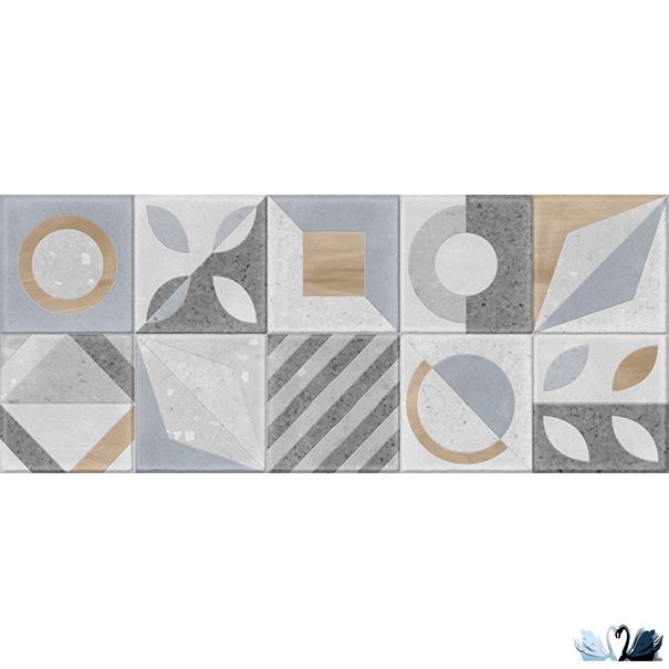 Цвет фона - серый. Фон имитирует мозаичную поверхность из десяти квадратов одинаковых по ширине стороны 12см. Этот декор - "сердце" коллекции! В технике пэчворк (patchwork) по поверхности плитки разбросаны принты с разной текстурой, но объединенных общей идеей серии.