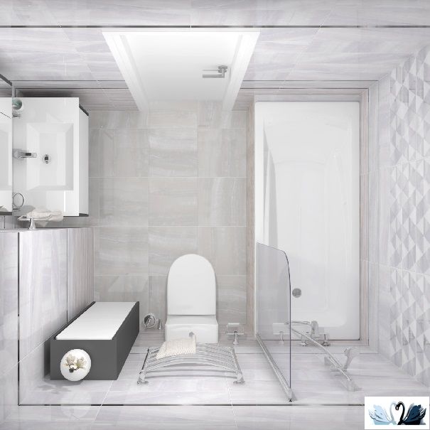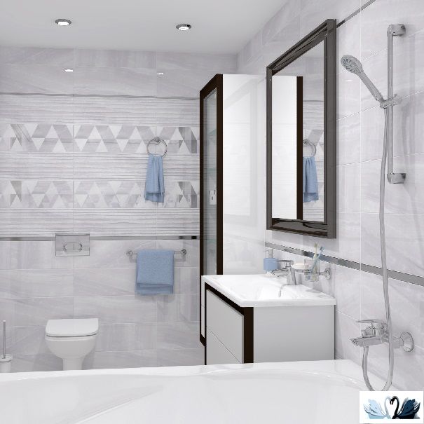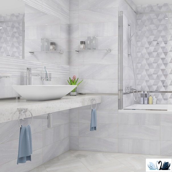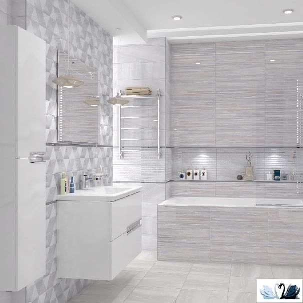 В серию входит фоновая плита трех цветовых решений (белого, бежевого, голубого) для пола и для стен, а также полосатый декофон в той же расцветке, два вида декоративных вставок с использованием металлизации и люстра, и мозаичный нарезной керамогранит.