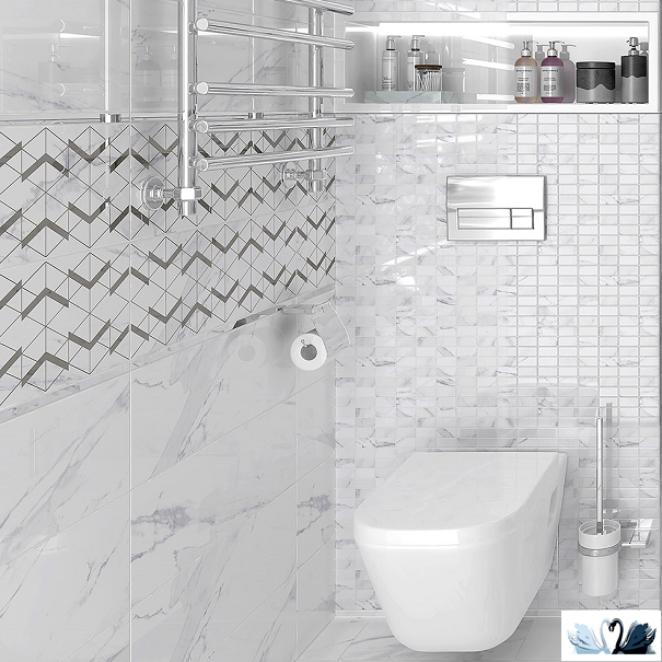 В серию входит настенная фоновая плита, напольный гранит, а также три варианта декоров с псевдо-мозаикой и геометрическим орнаментом с платиновой металлизированной ветрозой (Tact, Wing и Мозаика).