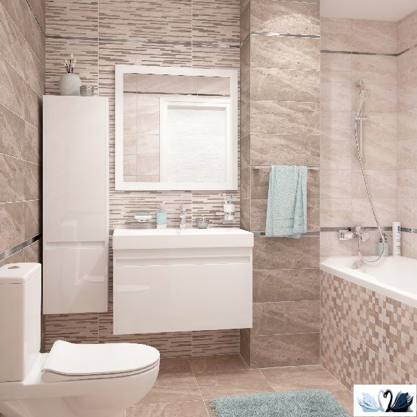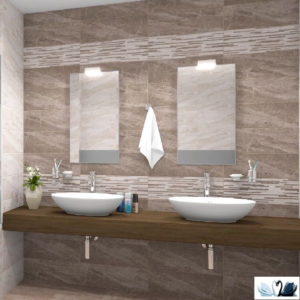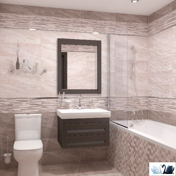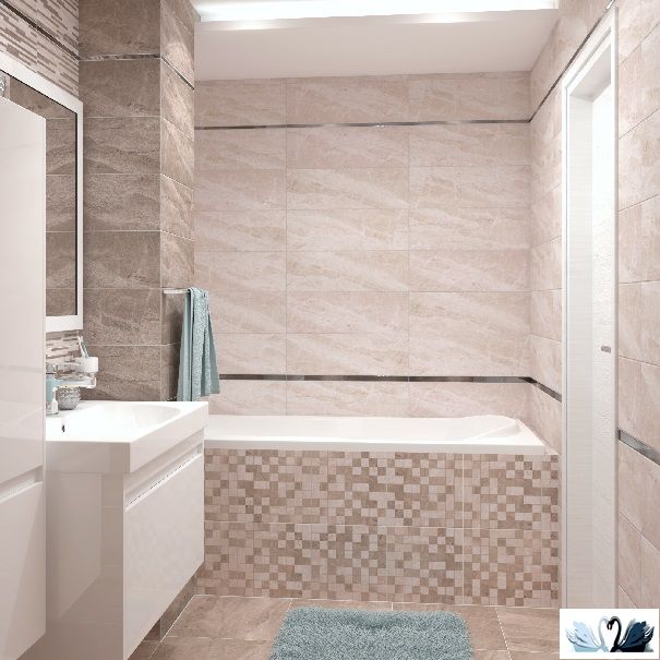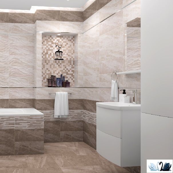 В серию входит фоновая плита двух цветовых решений (бежевого и серого) для пола и для стен, а также два варианта декофона с рельефом (мозаичный и волнообразный) в той же расцветке и псевдо-мозаика из керамогранита.