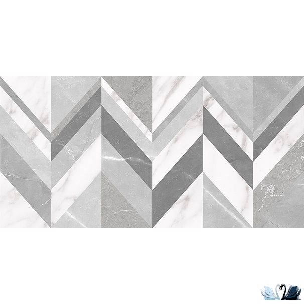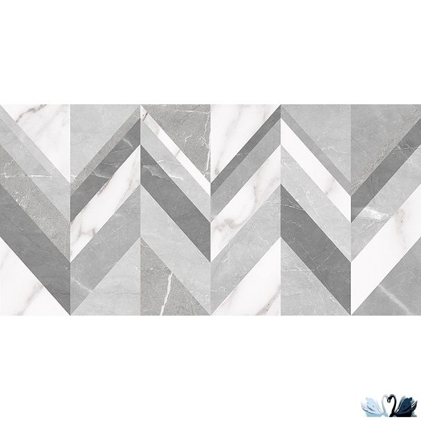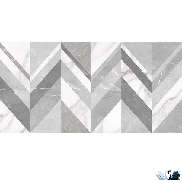 Венус с мозаичным узором - это прямоугольник, визуально разделенный на 6 вертикальных полос с геометрической мозаикой. Цвет фона - белый с серыми и черными прожилками, напоминающими натуральный итальянский мрамор Bianca Carrara. Цвет рисунка мозаики - разнообразный - белый, серый, светло-серый, графитовый.